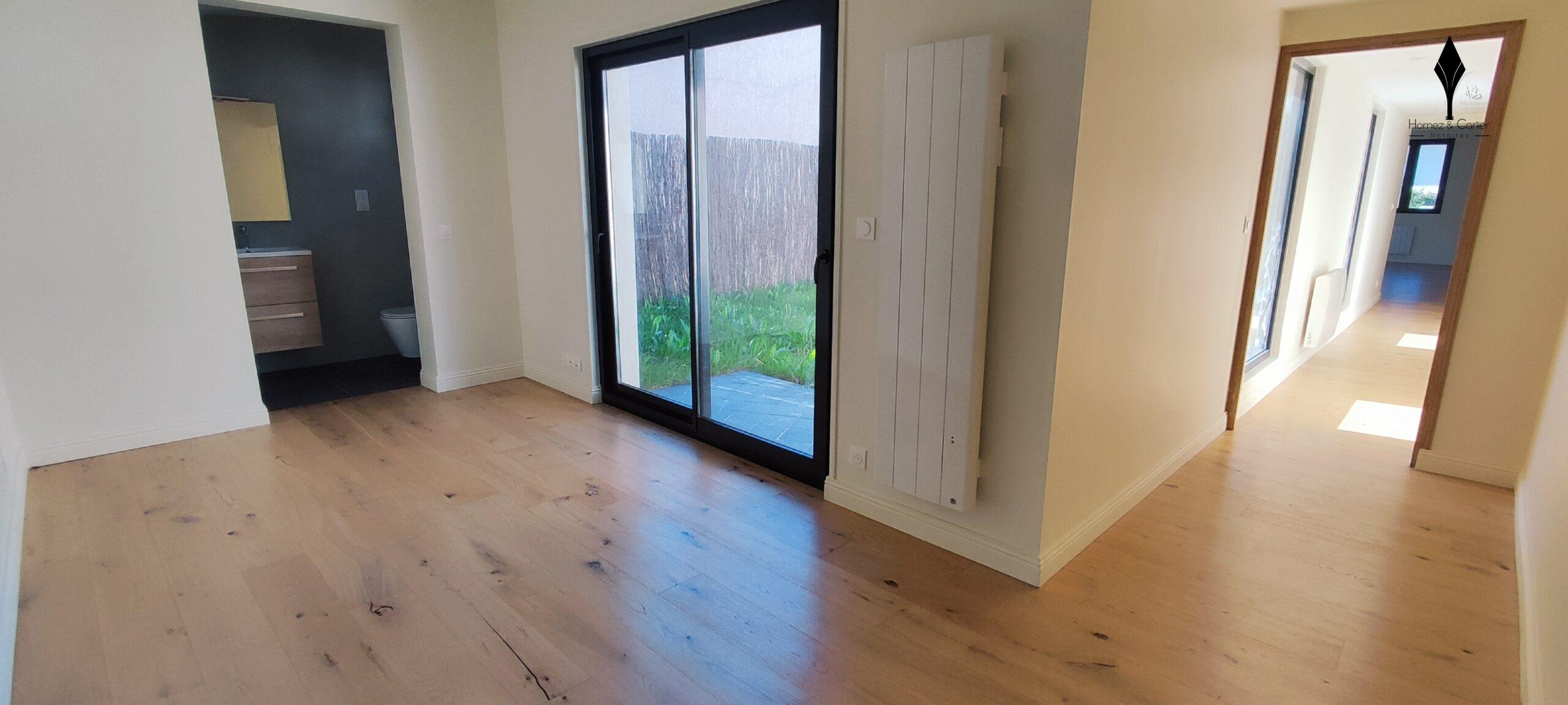 La cuisine ouverte est entièrement équipée et s'intègre parfaitement à l'espace de vie.Vous trouverez également une chambre avec sa salle d'eau privative et wc, bénéficiant d'un accès direct à une terrasse et au jardin de 199m².