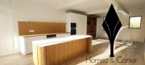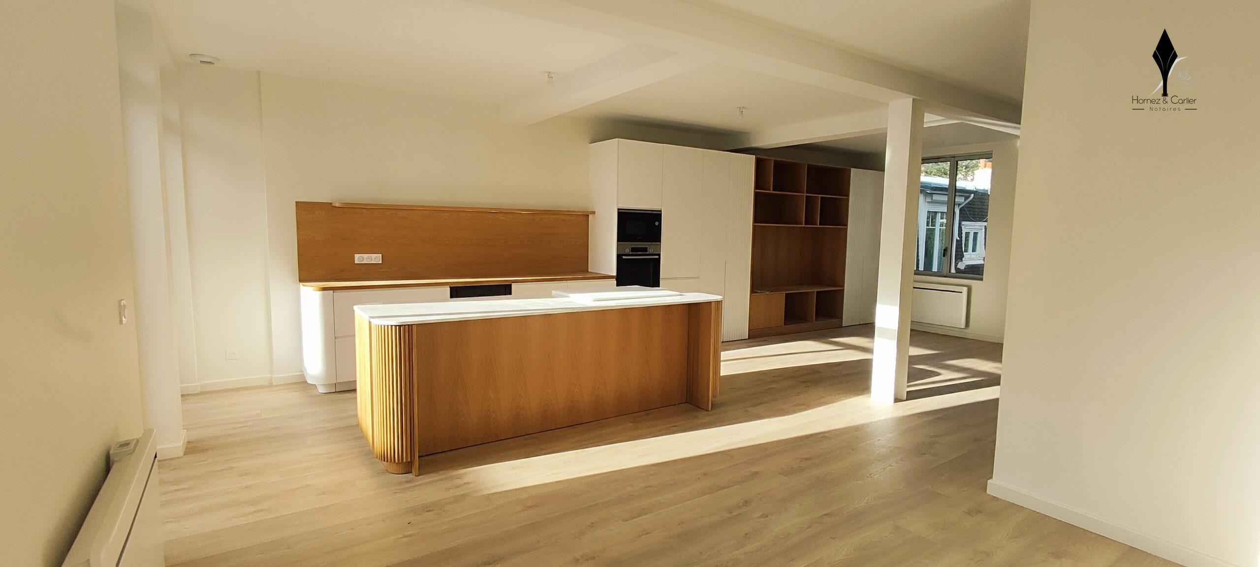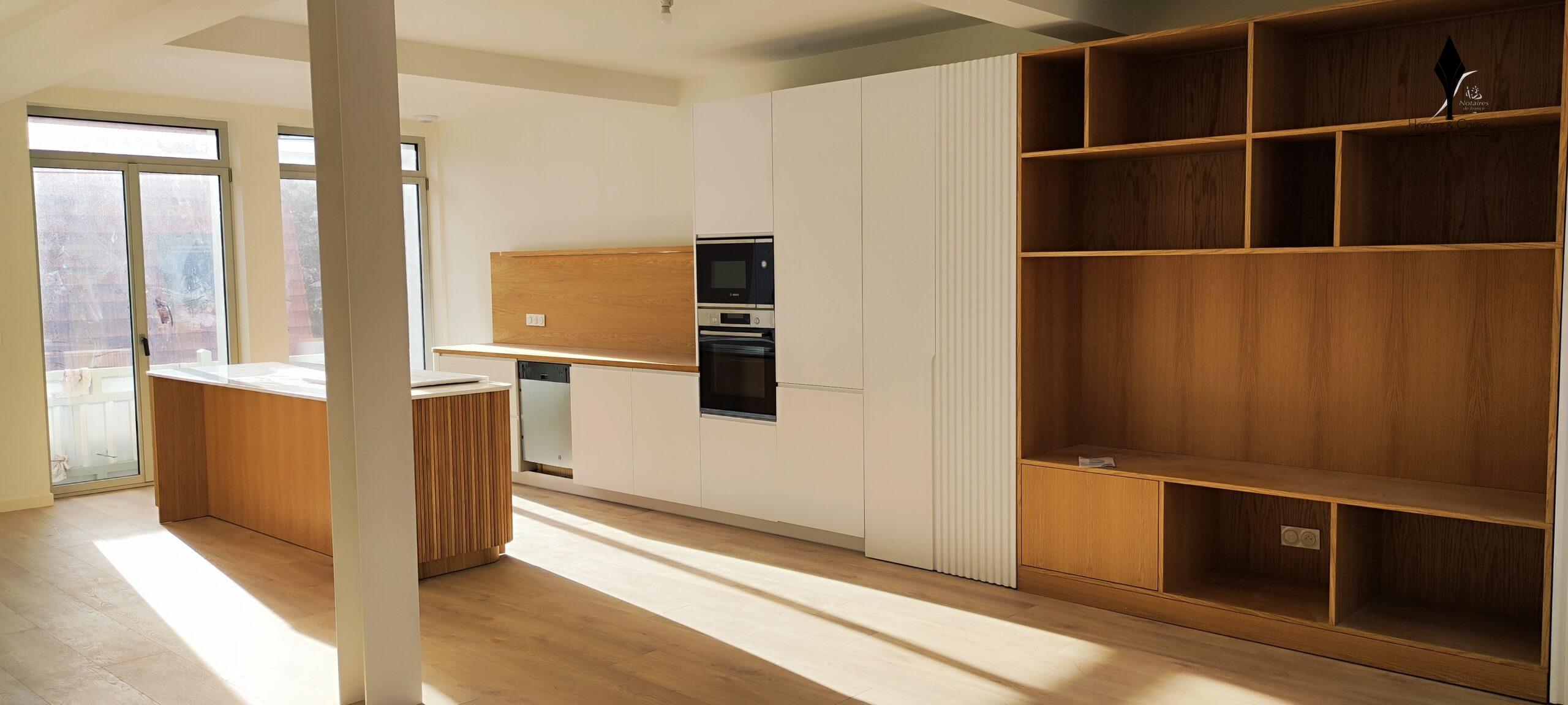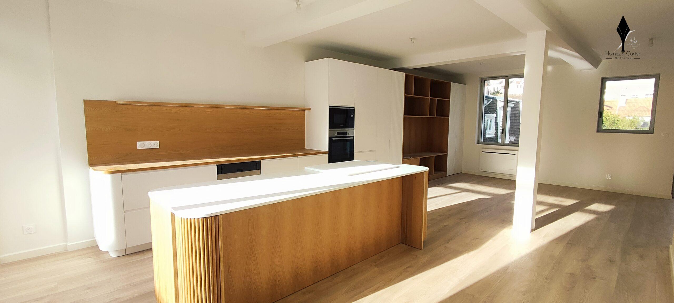 La cuisine contemporaine haut de gamme, avec son îlot central, s'intègre parfaitement à cet espace convivial, idéal pour recevoir.